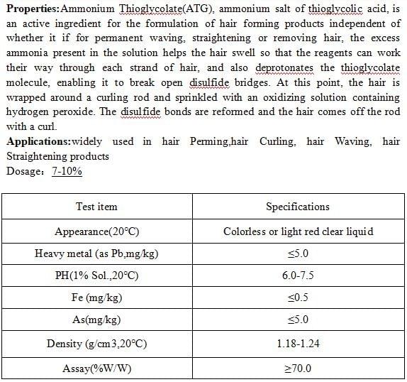 ATG is made from Japan/ German premium grade Thioglycolic acid, it's an active ingredient for the formulation of hair forming products independent of whether it if for permanent waving, straightening or removing hair.